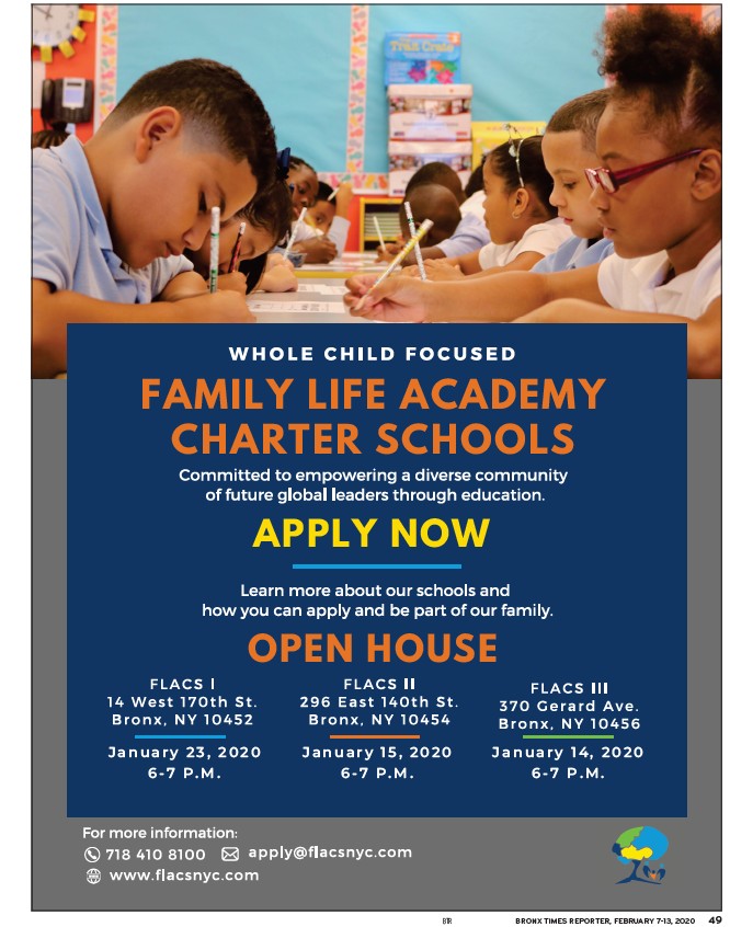 FAMILY LIFE ACADEMY CHARTER SCHOOLS APPLY NOW OPEN HOUSE BRONX TIMES REPORTER,BTR FEBRUARY 7-13, 2020 49 January 23, 2020 6-7 P.M. January 15, 2020 6-7 P.M. January 14, 2020 6-7 P.M.