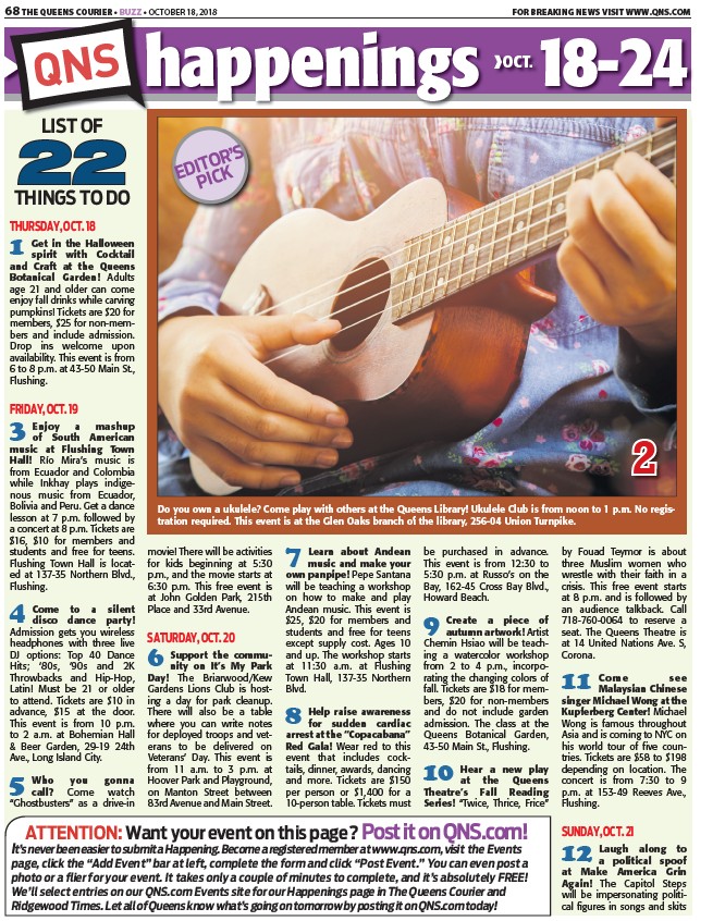 We’ll select entries on our QNS.com Events site for our Happenings page in The Queens Courier and