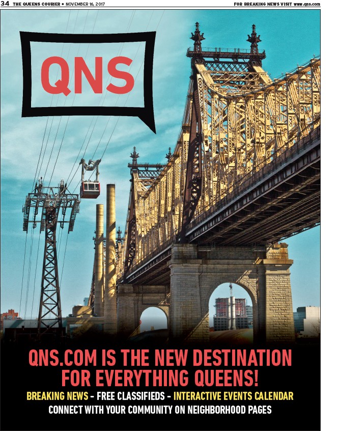 34 The Queens Courier • NOVEMBER 16, 2017 FOR BREAKING NEWS VISIT www.qns.com QNS.COM IS THE NEW DESTINATION FOR EVERYTHING QUEENS! BREAKING NEWS - FREE CLASSIFIEDS - INTERACTIVE EVENTS CALENDAR CONNECT WITH YOUR COMMUNITY ON NEIGHBORHOOD PAGES