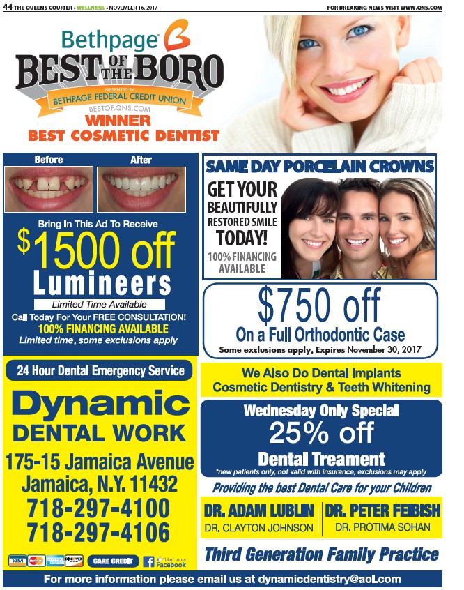44 THE QUEENS COURIER • WELLNESS • NOVEMBER 16, 2017 FOR BREAKING NEWS VISIT WWW.QNS.COM SAME DAY PORCELAIN CROWNS GET YOUR BEAUTIFULLY RESTORED SMILE TODAY! 100% FINANCING AVAILABLE Some exclusions apply. Expires